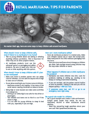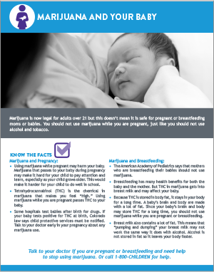 The Colorado Department of Public Health and Environment reviewed the science and translated the learnings into relevant messages for the public. This resulted in valuable literature about kids and marijuana for parents and other trusted adults, including information about the risks of marijuana use while pregnant and its effects on babies.